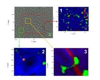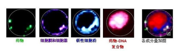 图7透射拉曼分析结果。左图:主成分定性分析结果;右图:偏小二乘法定量分析结果 由于拉曼光谱是无损的检测方法,它还可以用于药物与细胞之间相互作用的研究。如药物与细胞作用的位点、在细胞中的分布、药物在细胞内的动力学研究等等。因此,拉曼光谱也在药物的筛选等工作中有着广泛应用。图8是药物作用于细胞后的拉曼成像结果,其中绿色是纯药物的分布位置,紫色、蓝色和粉色分别是药物作用于细胞膜、细胞质和DNA形成复合物后的成分分布图。后一张是所有成分分布的叠加。