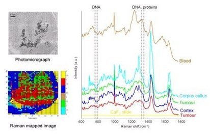 图4不同的甲状腺病变的拉曼光谱 此外,当疾病还处于早期阶段,组织结构上未见病变时,通过拉曼光谱的研究可以得到一些早期的病变信息。传统的癌症检测手段是病理标本染色法,但是这种方法只能检测出与健康组织有明显区别的病变组织,当疾病还处于隐形阶段时则很难检测出来,这也是为什么发现癌症一般都是晚期的原因。而拉曼可以获得细微的化学结构信息,即使是早期肿瘤,由于其DNA含量会急剧增加,拉曼可以捕捉到这些变化。如图5中早期肿瘤(绿色)和晚期肿瘤(红色)的DNA拉曼峰强要明显高于健康组织(胼胝体,皮质和血液)。拉曼成像图中红色区域的晚期肿瘤与染色法诊断出的病理学吻合,而绿色区域的拉曼谱图与红色区域的谱图一致,说明已经发生病变,然而染色法却没有将其检测出来。