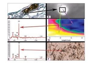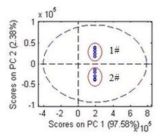 图11不同饱和度脂肪酸甘油酯的主成分分析结果 很多同类食品的结构非常相似,如食用油都是脂肪酸,但是动物食用油主要是饱和脂肪酸,而植物油主要是不饱和脂肪酸。对于这些结构相似的化合物,使用化学计量学方法可以有效地将它们区分开,如图11中的硬脂酸甘油酯,1#样品含不饱和脂肪酸甘油酯,而2#样品是饱和脂肪酸甘油酯,两种样品各取6个点,经主成分分析法归类后发现,拉曼可以区分开这两种非常相近的样品。 2007年美国发生多起猫、狗宠物中毒死亡事件,经拉曼研究分析发现猫粮中的三聚氰胺和三聚氰酸可以在肾组织中形成复合物晶体,阻塞肾小管内腔,量多严重者可致死。图12是猫服用三聚氰胺、三聚氰酸添加猫粮后在肾中形成复合物晶体的拉曼分析结果[5],A是猫肾显微图像,B是肾中形成的结晶,其中黑色框是拉曼成像位置,C是成像区域的拉曼图,D是伪彩色显示的拉曼强度分布图,E、F是体外模拟实验得到的复合物拉曼谱图和显微图。实验结果显示猫肾中形成的结晶与体外合成得到的结晶成分一致。