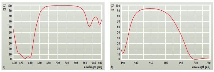 图3:694nm和633nm的特殊光束组合器的反射光谱: a)PRr(45°,694nm)= 99.0%+ Rr(45°,633nm)<35% b)Rr(45°,630-640nm)> 35%+ Rp(45°,694nm)<0.3% Output Couplers and Lenses 输出耦合器和透镜