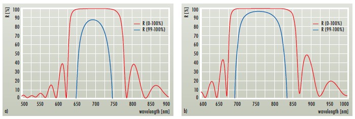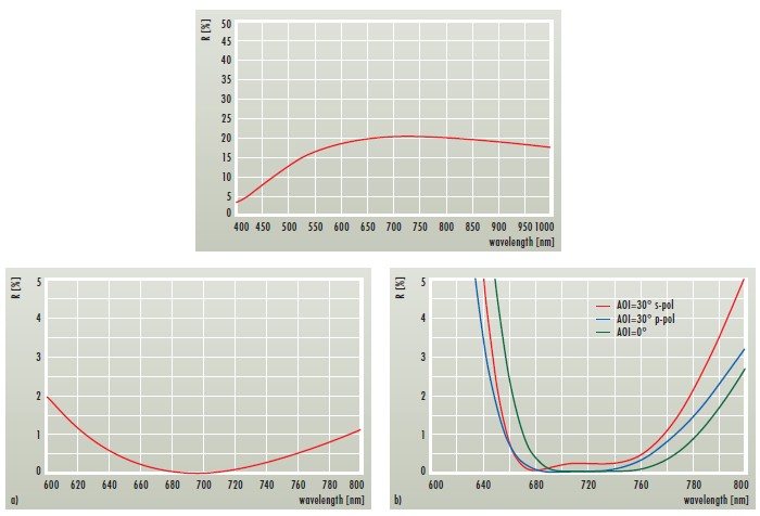图4:694nm和755nm的AR涂层的反射光谱:a)AR(0°,694nm)<0.2%,b)AR(0°-30°,755nm)<0.5% •具有精调节反射率的输出耦合器 •在输出耦合器的后侧以及由熔融石英制成的透镜和窗户两侧的残余反射率R <0.2%的AR涂层 |