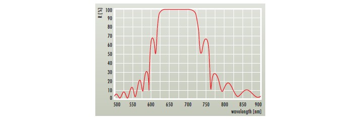 图2:694nm的转向镜与633nm的导频激光器(非偏振光)的反射光谱 梁组合 •通过溅射技术精调节反射率 •集成导频激光束对准(例如635nm) •具有特殊设计的高性能和成本优化解决方案