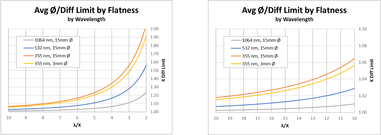 图 3:经过七次反射后,平均光斑直径与衍射极限光斑直径之比(Ø ÷ diffraction limited Ø)随平面度指标变化的关系曲线,左侧按输入光束直径分类,右侧按聚焦光斑尺寸分类。较大的光束需要更大的反射镜;因此,每个系统的绝对反射镜平面度要求是不同的。在这两种情况下,当平面度达到 λ/5 时,误差比接近 1(即接近衍射极限),而在 λ/10 以内实际上已达到衍射极限。在本示例系统中,平面度优于 λ/10 所带来的增益非常小。 从数据图中可以看到: • 当平面度优于λ/10 时,光斑大小几乎不再随平面度提升而显著改善(曲线趋于平缓)。 • 只有当你的应用极端敏感,需要将误差控制在衍射极限的微小分毫内,λ/20 才有意义。 四、警惕波长陷阱:紫外与红外的区别 千万不要忽略波长的影响! 平面度通常是在 632.8nm (HeNe激光) 下测试的。 • 如果你使用的是 1064nm (红外) 激光,波长更长,对表面误差的敏感度降低,λ/10 的效果甚至相当于可见光下的 λ/20。 • 但如果你使用的是 355nm (紫外) 激光,波长变短,表面误差的影响会被放大。
