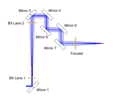 图 1:光束在代表平面度误差的球面上发生 90° 反射的示意图(代表被极度放大的平面度误差)。与折叠轴垂直(ꓕ)的光束轴比与折叠轴平行(||)的光束轴经历更强的反射镜曲率,从而在出射光束中产生像散。 • 垂直于折叠轴的方向: 光束“跨越”了镜片的弯曲面,感受到了镜片的“光焦度”。 • 平行于折叠轴的方向: 光束感受到的弯曲较小。 这种不平衡导致光束在两个方向上的聚焦能力不同,最终输出的光斑不再是完美的圆形,而是发生了畸变。这种像散在多面反射镜系统中是累加的! 三、仿真实测:λ/10 到底够不够用? 为了验证影响程度,我们使用 Ansys Zemax OpticStudio 搭建了一个包含7面反射镜的扩束系统模型。