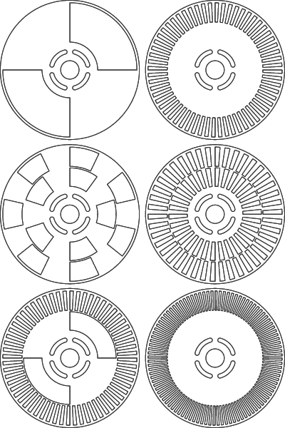 3502 光学斩波器系统包含六个斩波轮,斩波频率为 4 Hz 到 10.65 kHz。顶部一排显示的是 2 槽和 60 槽轮。中间一排显示 7/5 槽和 42/30 槽轮,底部一排显示 60/2 槽和 100 槽轮。所有斩波轮直径均为 4.50 英寸 (114.3 mm)。