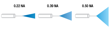 数值孔径(NA)决定了光从针头顶端的光纤出射的锥角。0.22 NA光纤在较小的区域产生强烈的锥形光,而0.39 NA光纤输入光的锥角比较宽,它照亮的区域更大,但光强更低(如上图所示)。