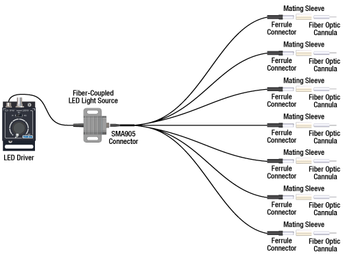 七个陶瓷插芯兼容我们的可植入光纤针头。我们Ø1.25 mm插芯的针头兼容ADAL1匹配套管和ADAL3互连件。我们Ø2.5 mm插芯的针头兼容ADAF1匹配套管和ADAF2互连件。光纤跳线的陶瓷插芯直径选择应该与可植入光纤针头的插芯直径相匹配。针头与不同插芯材质的光纤跳线可连接匹配,不会导致明显的额外信号损耗。但纤芯尺寸、数值孔径(NA)和插芯直径应该相互匹配,以实现正确连接和**信号强度。光纤束的另一端为SMA905接头,用于连接其他组件,例如我们带SMA接头的光纤耦合LED。